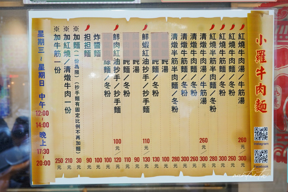小羅牛肉麵的菜單設計,主要是以各式麵食為主,除了大家熟知的牛肉麵之外,還有像是紅油抄手、擔擔麵、炸醬麵等多種選擇。這裡的牛肉麵價格在基隆當地來說,確實是比較高的,大約落在260元到300元之間,不過既然它獲得了紅燒組的銀牌,我第一次來,當然就毫不猶豫地點了紅燒牛肉麵來好好品嚐看看味道。