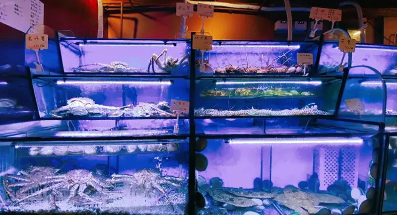 一走進餐廳,就可以看到超多、超大的水族缸,真的讓人眼球地震,【拿靠生猛海鮮】主打澎湖直送的現撈活海鮮,魚缸裡活跳跳的海鮮種類超過 10 種以上,從比目魚、七星斑、花蟹到帝王蟹、巨無霸貝類~應有盡有~