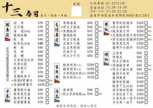 每日魚貨依天候與漁況調整,師傅每天挑選台灣新鮮魚貨,再依食材特性調整刀工,只端上「當天最好的那一塊」。 下次來嘉義,留一點時間在十三壽司這裡無論是套餐、特選壽司還是
