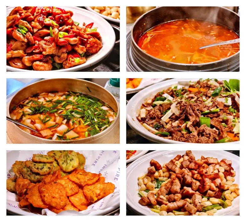 ▼韓式熱菜區有:泡菜鍋湯、辣炒雞丁、韓式炒牛肉、海鮮煎餅 / 蔬菜煎餅、烤五花肉。