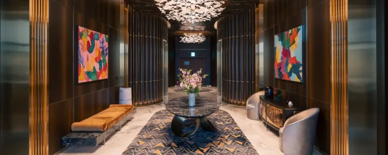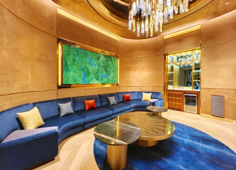 ▼Rotunda 環形大堂其設計理念來自於 Steelman Partners 與紐約室內設計師 Jeffrey Beers 的聯手打造,目的在於融合「文化真實感」與「奢華氛圍」,希望讓訪客一走進來就如置身劇院般沉浸其中。中央懸掛著一座動態吊燈,由 156 個 LED 面板組成,燈體會隨著節奏緩緩變幻顏色,並且搭配音效,不定期會有藝術展演。