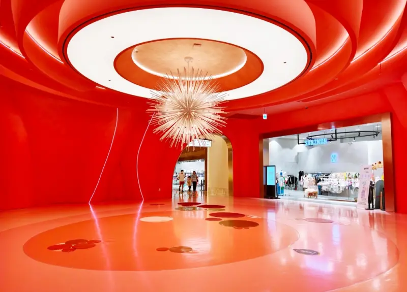 ▼極光立方位在極光道的出入口,是韓綜 Running Man 取景地。兩側與中間的投影影像細緻燦亮,整座中庭由雙邊電扶梯框起,配合天花板燈光與大理石地面反射出的光影,形成如鏡像宮殿般的錯視感。