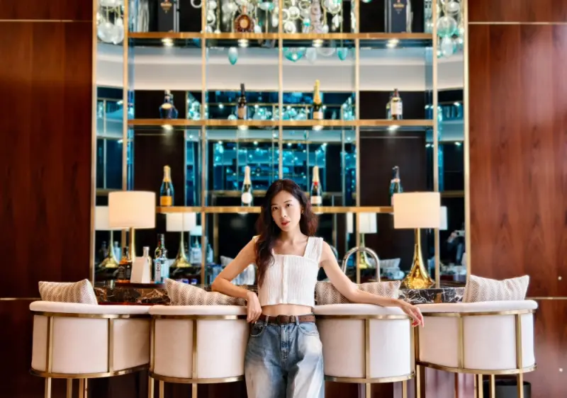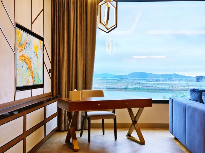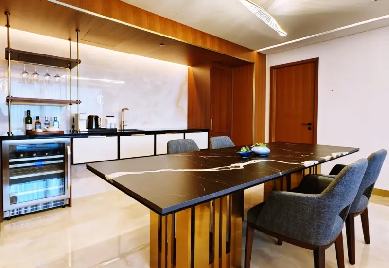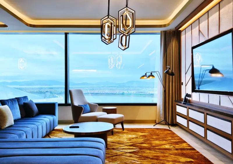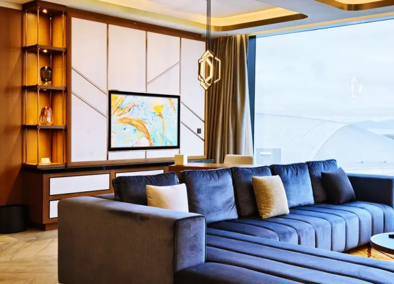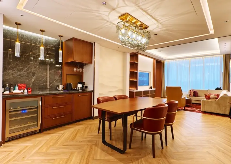 ▼海洋樓迎仕柏套房以大面積落地窗與高挑設計,拉開窗簾可欣賞客機起飛。客廳配置深藍色沙發與暖色地毯,;餐飲區設有黑金相間餐桌與獨立酒櫃,還可免費使用酒窖,整體裝潢以木質元素搭配現代燈飾,融合典雅與摩登。