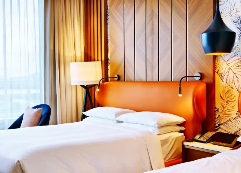 ▼翠林樓豪華家庭雙床房以活潑又舒適的設計打造親子共遊的溫馨空間。設有兩張大床,搭配鮮明的橘色床頭與木質牆面。