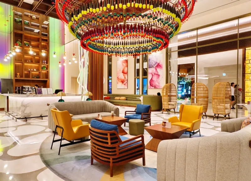 ▼這次入住輝映樓,大廳以挑高空間結合波浪木質天花與典雅燈飾,營造流動感。綠色吧台搭配金色吊燈,花卉圖騰地毯與彩色單椅,為空間注入藝術氣息。