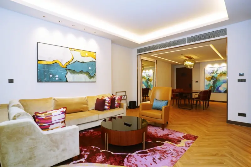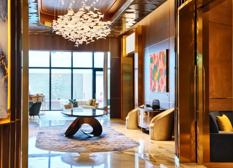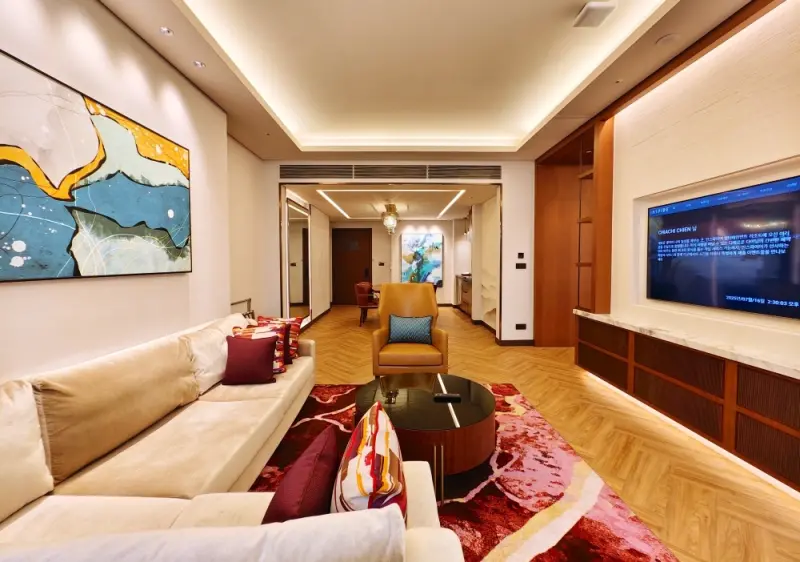 ▼迎仕柏度假城內一共有五間總統套房,面積達 145-150 坪,進入套房之前,會先經過大理石的走廊、吊燈與藝術畫作,才剛踏入總統套房就被震攝。