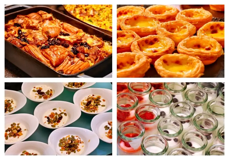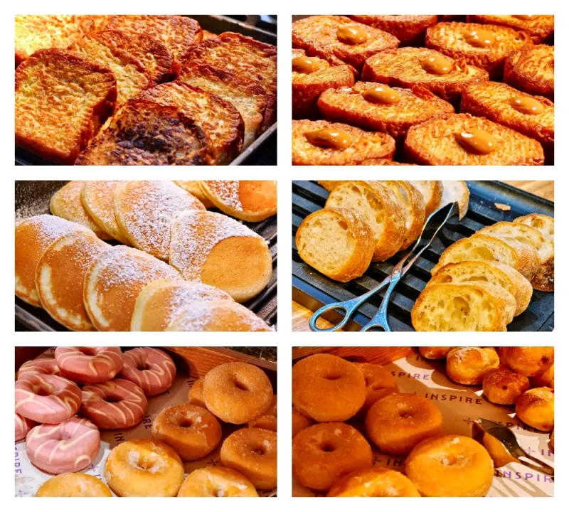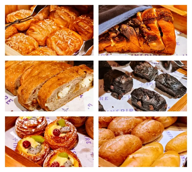 ▼西式麵包 & 甜點區有法式吐司、焦糖布里歐麵包、鬆餅、法國麵包、甜甜圈、可頌 & 起酥點心、巧克力麵包、堅果麵包、布朗尼、水果丹麥派、麵包布丁、葡式蛋撻、優格、奶酪。