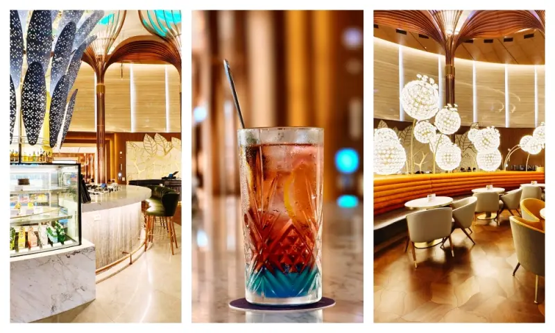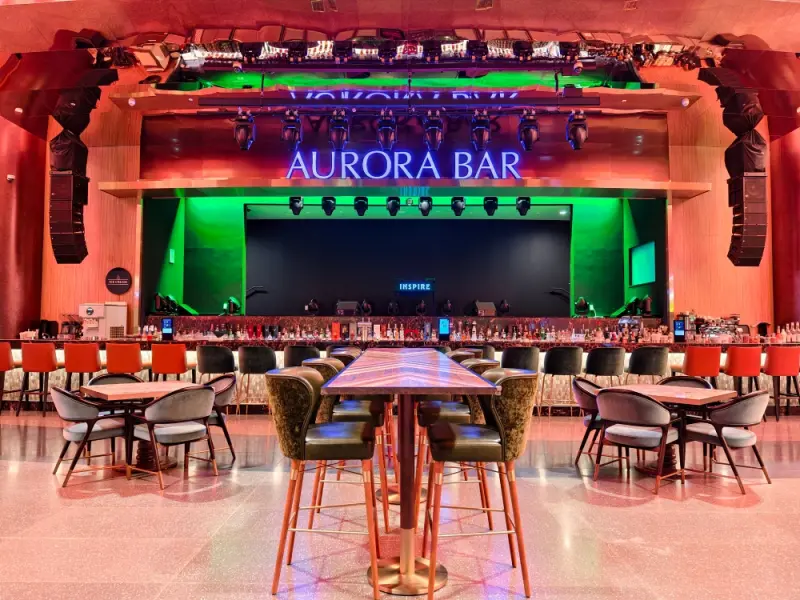▼極光吧以金屬光澤、絢爛燈光及沉穩色調打造出高級感,坐在吧台區能隨時欣賞沉浸式藝術展演,這裡的專業調酒師都能為客人量身打造專屬滋味的調酒。