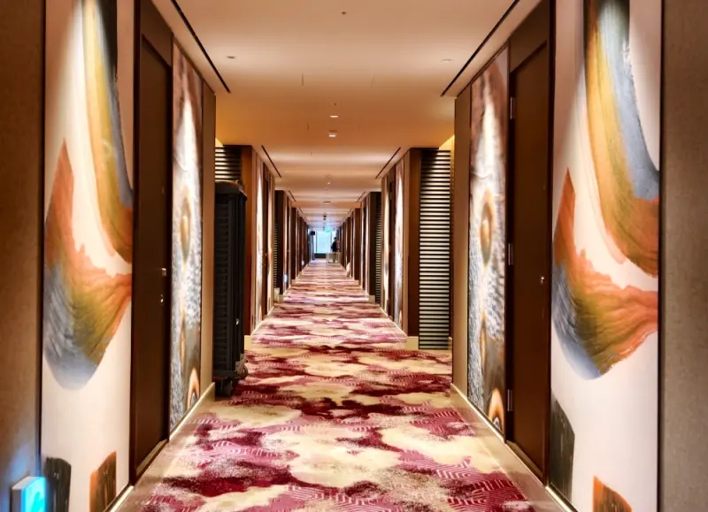 ▼通往客房的走廊以抽象彩繪牆面與絢麗紫紅地毯鋪陳,線條流動感十足,搭配柔和燈光,延伸出藝術感。