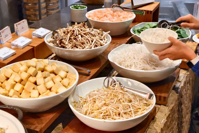 ▼現煮麵食,將想要的麵條與蔬菜放入碗中,交給廚師燙熟
