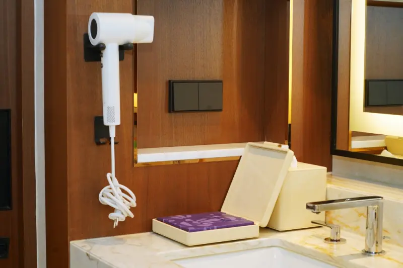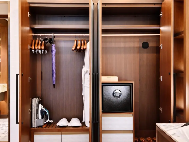 ▼衣櫥空間附多組木質衣架、浴袍、雨傘與燙衣設備、保險箱、縫紉組與鞋刷、鞋撐與專屬拖鞋袋,讓皮鞋與休閒鞋都能保持完美狀態,滿足旅客從休閒到商務的各種需求,細節周全。