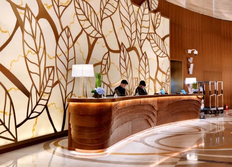 ▼迎仕柏度假城櫃檯牆面以金色線條勾勒出葉片紋理,形成充滿自然律動的藝術空間,與度假城緊鄰自然的理念呼應。