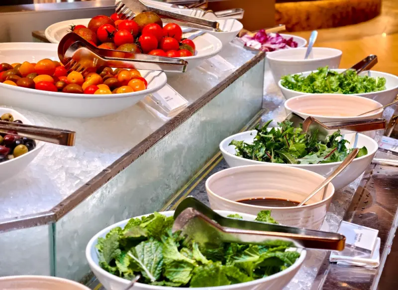 ▼新鮮蔬果、綠色蔬菜種類多,有各色小番茄、橄欖拼盤、各式生菜,很多都是小片嫩葉類,好入口。