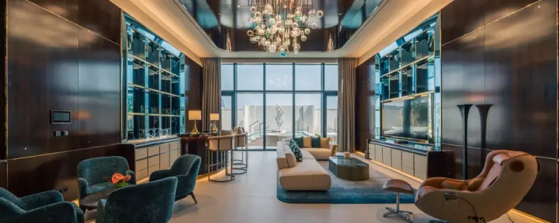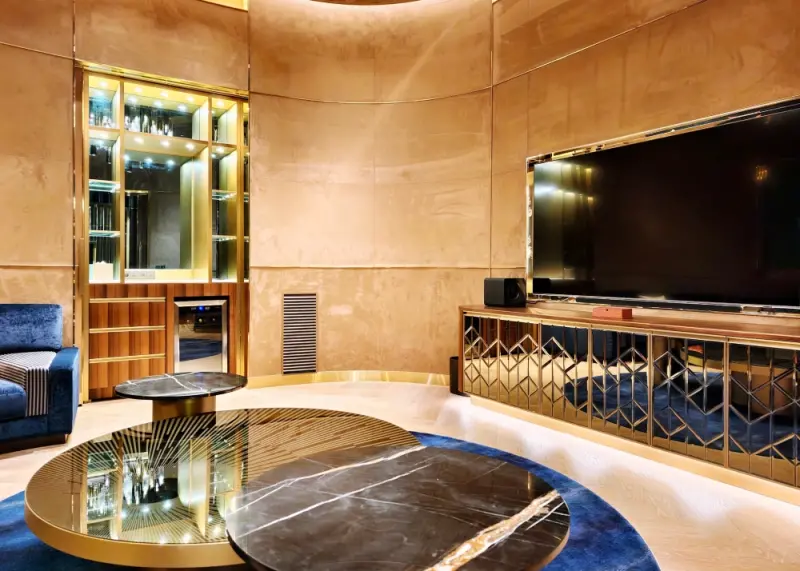 ▼背後的鏡面展示櫃與私人酒吧,典雅又實用,天花板的水晶吊燈在夜晚時燈光映照整個空間,將奢華格調提升到另一層次。照片中右側備有舒適按摩椅。(照片取自官網)