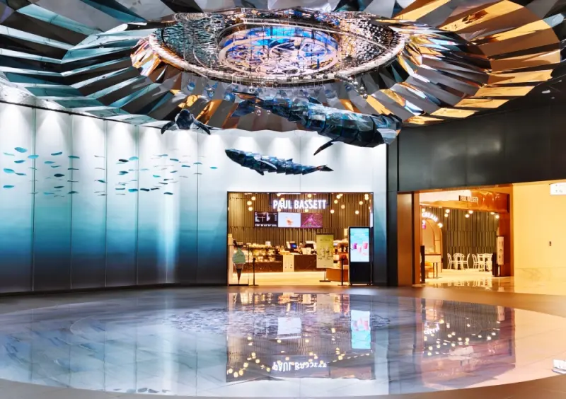▼悅動的靈感來自於海洋深處的生命力與潮汐律動,空中懸掛著大型金屬鯨魚雕塑,在燈光與鏡面反射下,就像正隨著海浪優雅地悠遊,地面則以光滑如水的鏡面石材鋪陳,倒映出整體空間的藝術感,視覺層次豐富。