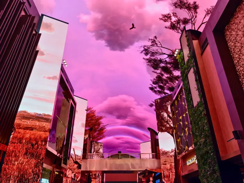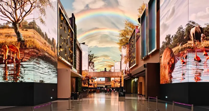 ▼極光道(Aurora)是長達 150 米 的沉浸式數位藝術街,是目前東北亞最大的室內媒體藝術體驗空間之一,這條數位天幕大道,頂端與兩側全是超高清 LED 螢幕,平時會有熱帶叢林影像循環播放,很多遊客為了極光道而來。