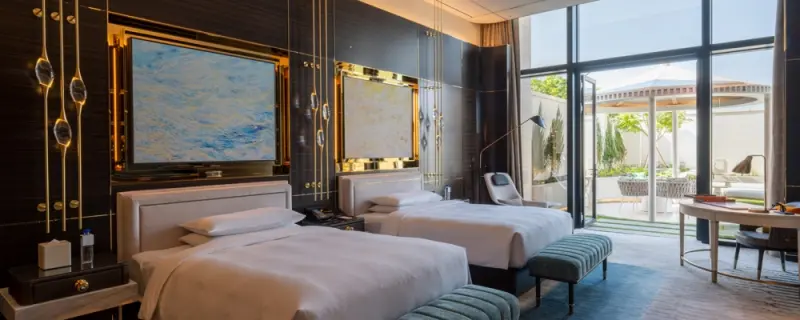 ▼有 2 間臥房配有1 張大床、2 張雙人床與 2 套衛浴,設計高雅,大片落地窗直通私人花園與泳池,採光極佳。柔和燈光映照著金屬線條,高級卻不張揚。