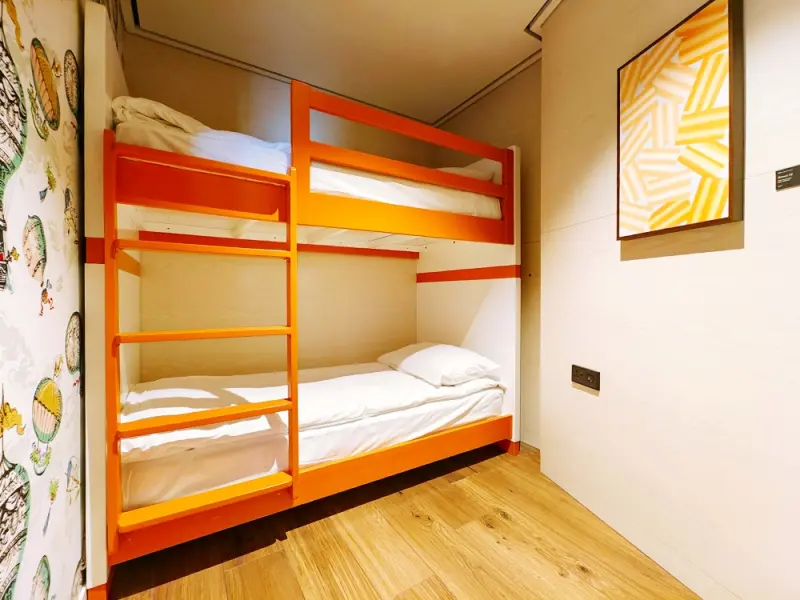 ▼雙床的對面有小孩專屬的上下舖床鋪,以亮眼色彩點綴,讓孩子們住得開心又自在,擁有一處專屬於自己的小天地。