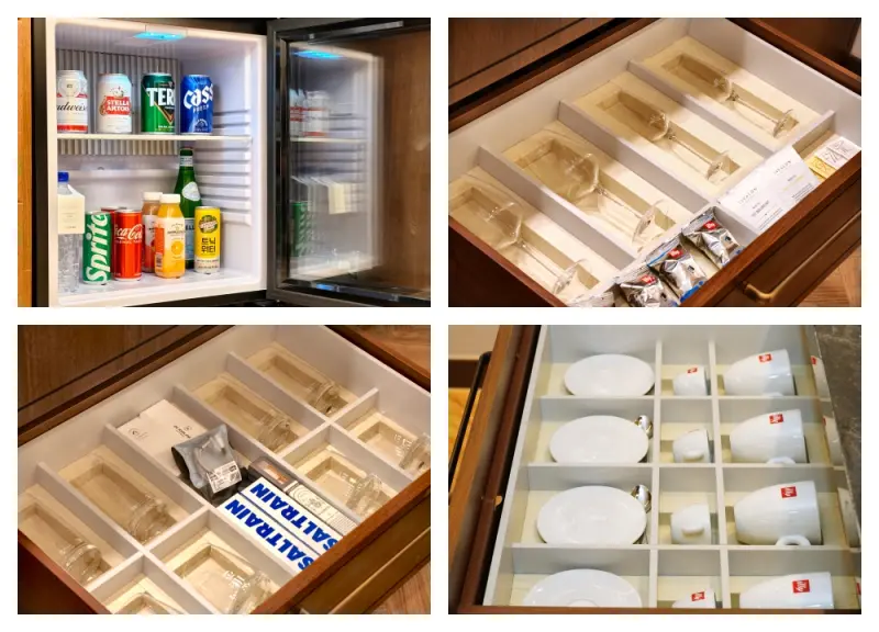 ▼香檳杯、各種酒杯、馬克杯與茶杯,一應俱全。餐具收納整齊分格,抽屜一拉就是完整的小吧台,像入住私人招待所,冰箱內的飲料、抽屜內包裝好的充電線,也都要付費