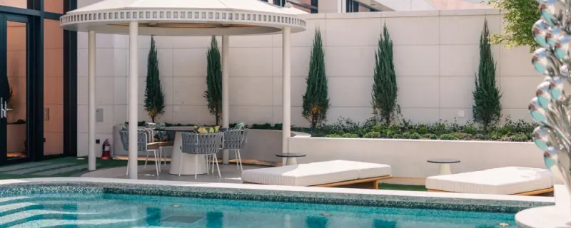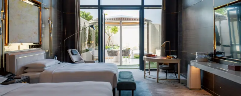 ▼落地窗外是專屬的花園與泳池區,保有隱私與度假的愜意。沐浴備品採用歐洲頂級香氛品牌(Diptyque & Penhaligon's)豪華洗浴用品,正好凸顯「法式優雅 + 英倫經典」的雙重格調。