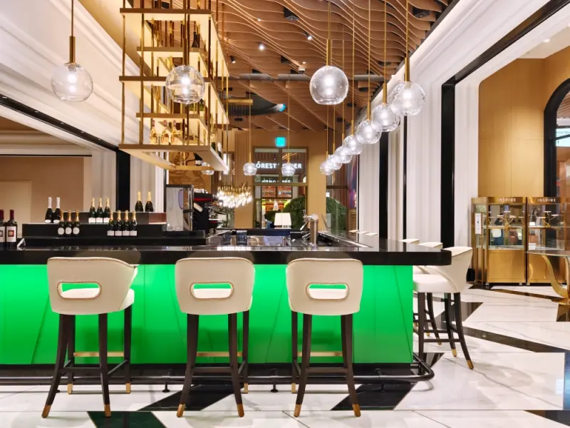 ▼迎仕柏度假城三座酒店大樓分別是輝映樓、翠林樓、海洋樓,每座酒店大樓都有專屬酒廊。輝映酒廊以綠光吧檯為視覺焦點,搭配流線木質天花與整排懸吊水晶球燈,營造出時尚又奢華的氣息。