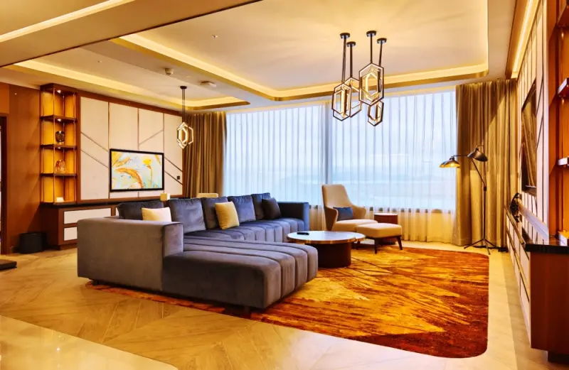 ▼總統套房的客廳大片落地窗引入自然光與戶外景觀,客廳以米白沙發與藍灰色單椅組成舒適的休憩空間,搭配圓形玻璃茶几與幾何抱枕,細節顯現品味。