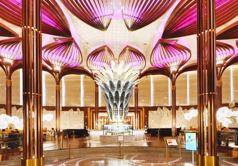 ▼櫃檯前方的地平線酒廊是結合藝術與奢華的夢幻空間,挑高穹頂下,如花朵綻放的雕塑與絢麗燈光很浪漫。