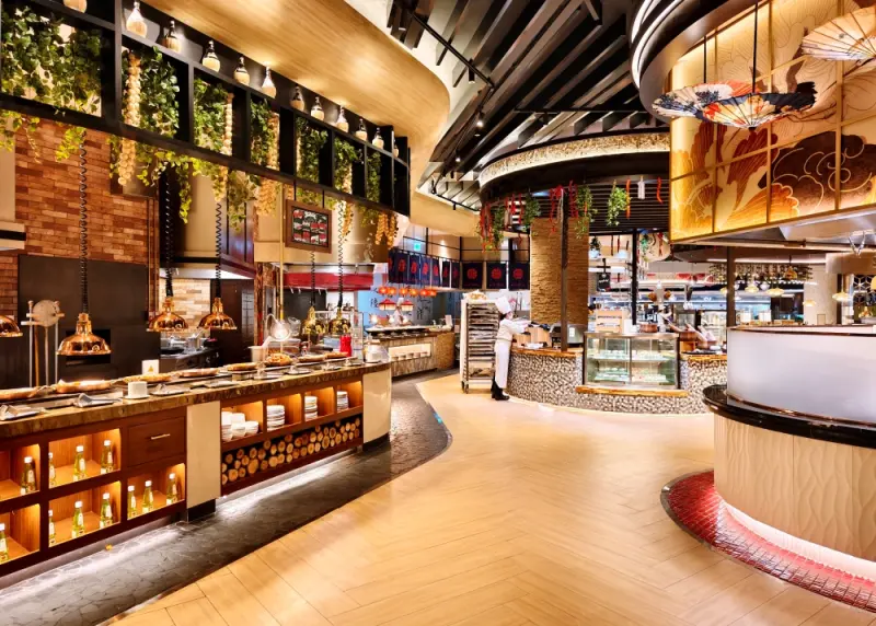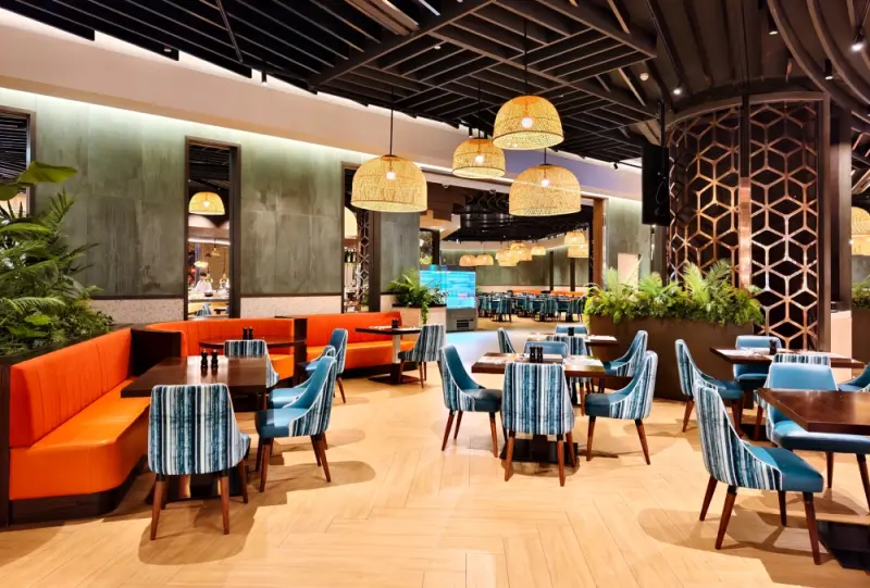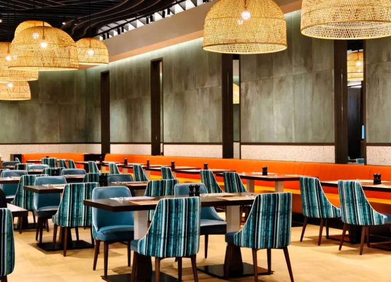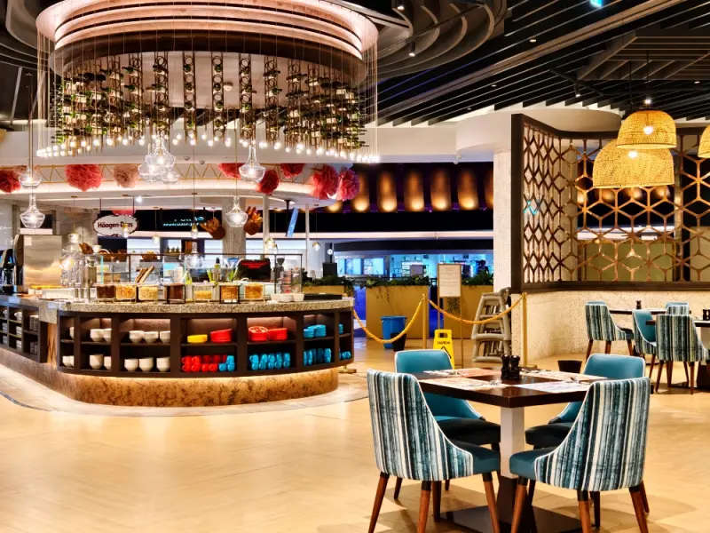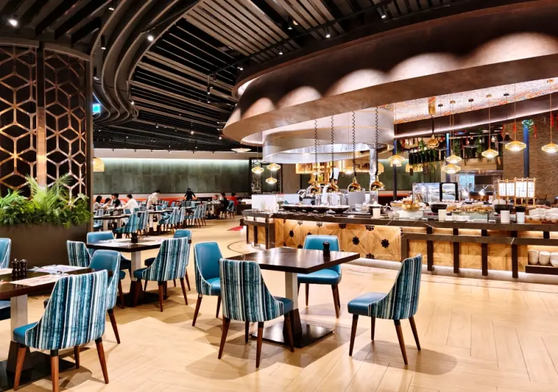 ▼大廚自助餐廳的用餐空間寬敞明亮,藍綠色條紋餐椅搭配橘色沙發,營造出活潑不失優雅的視覺效果。天花板以獨特幾何線條設計,搭配溫暖的藤編吊燈與綠植點綴,讓整體空間更顯自然舒適。早餐用餐時間分兩梯次,