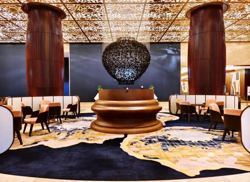 ▼挑高天花板滿佈金色雕花,奢華感滿點;中央懸掛的黑色球形藝術裝置,兩側厚實木柱展現氣勢,搭配柔和色系的座椅,高雅大器。