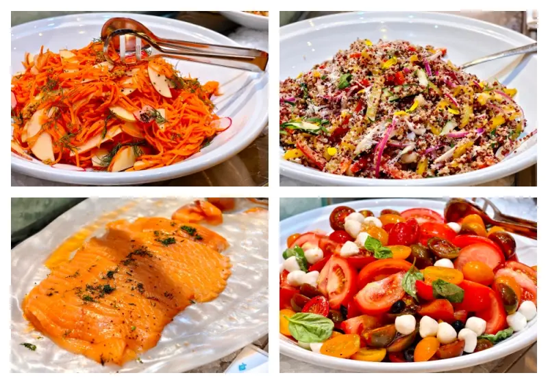 ▼沙拉 & 冷盤有蘋果紅蘿蔔沙拉、藜麥沙拉、煙燻鮭魚片、番茄乳酪沙拉、小番茄、莫札瑞拉起司、羅勒葉。