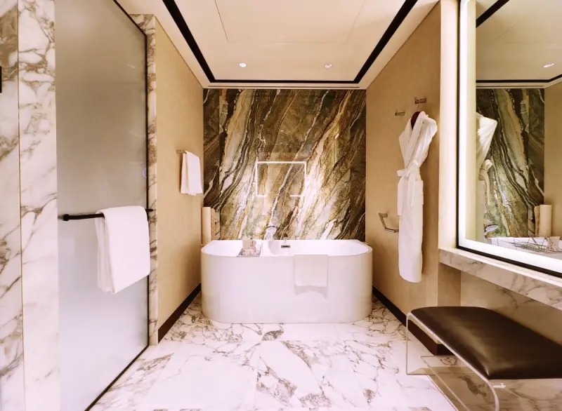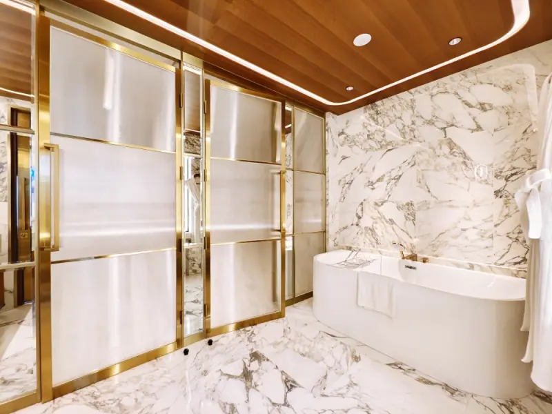 ▼浴室則以整面大理石鋪設,金色框架玻璃拉門與獨立浴缸設計,乾溼分離的空間讓使用更加便利。