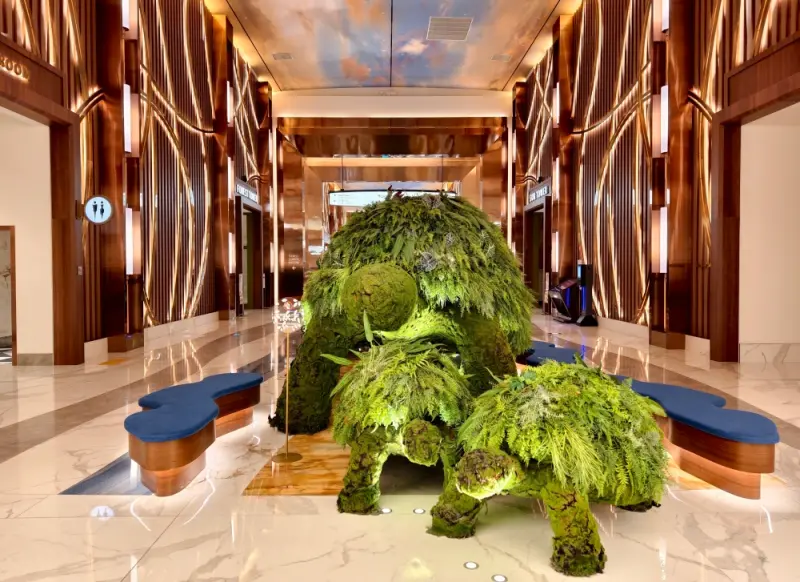 ▼通往各酒店大樓的廊道,最吸睛的是由綠植打造的烏龜雕塑,生機盎然。三座酒店大樓雖然各自獨立,但是都能透過廊道互通,也就是說,進來之後都不用顧慮天氣問題,除了戶外的「歡聚公園」,其他吃喝玩樂都能在室內解決。