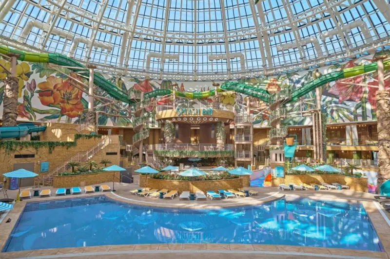 ▼SPLASH BAY 全室內大型水上樂園玻璃穹頂之下,花卉壁畫奔放綻放,搭配熱帶植栽與翠綠滑水道,營造出一個像「都市雨林」的戲水空間。 玻璃穹頂在白天能廣泛映入自然光,有在戶外戲水的感覺,但不受天候限制。