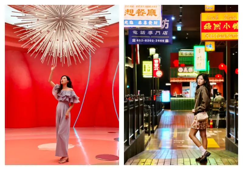 ▼其他值得一拍的還有美食街,美食街其中一景以濃烈的港式街頭風格打造:色彩鮮明的霓虹燈箱懸掛,搭配復古字體與顏色,將人帶回到老香港電影場景。