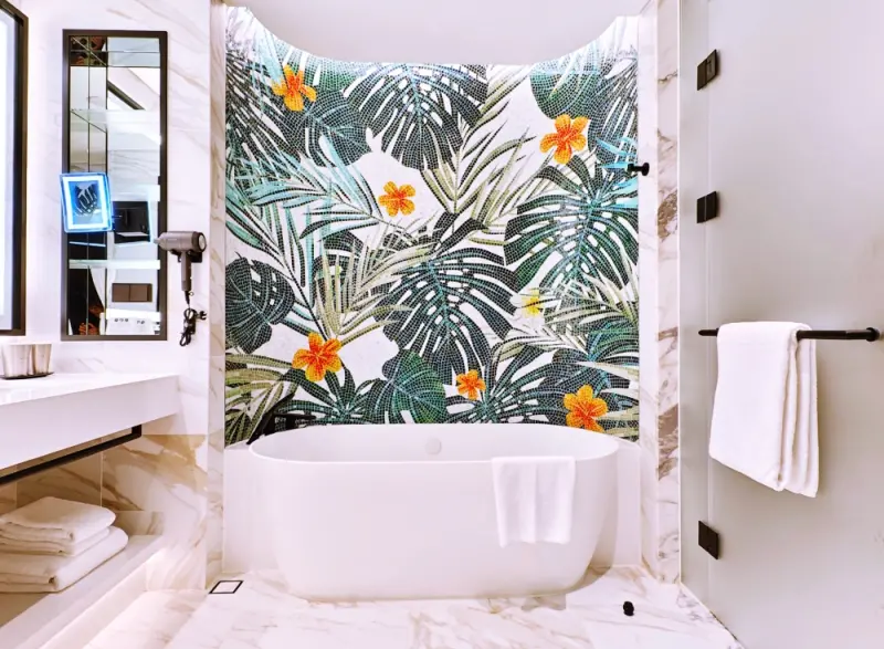 ▼浴室的熱帶花葉馬賽克牆面搭配獨立浴缸,有濃厚的度假氣息。