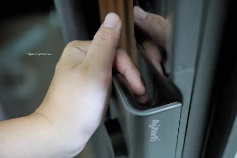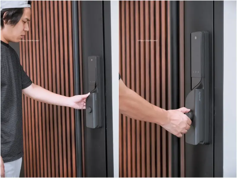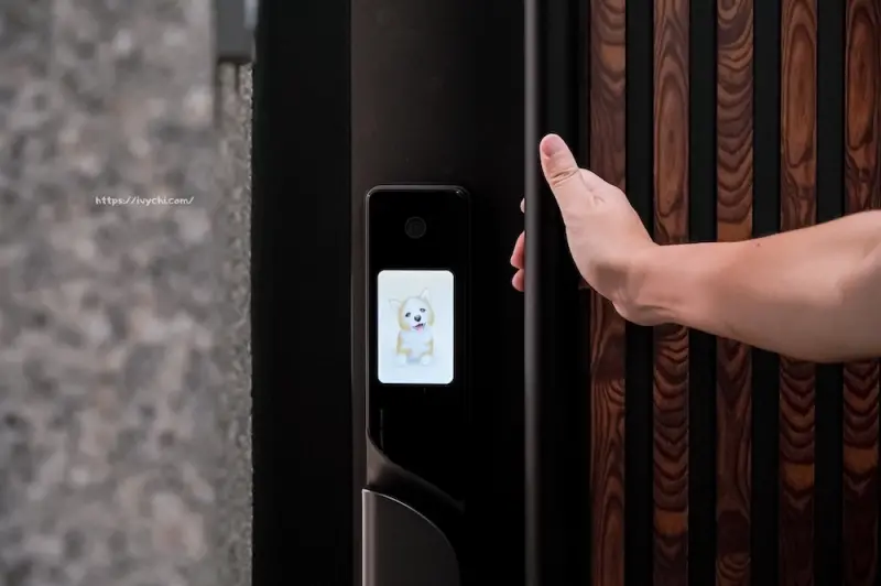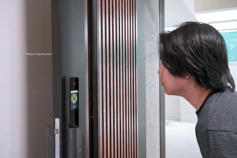 從家裡要出門的開門方式也有設計兩種,一種是我們把手指感應開門,另一種是旋轉門扭開啟,兩種都很順暢,我覺得手指感應直接推開最方便~