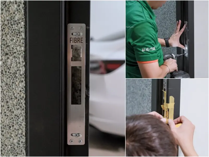 最後做門框側板的安裝,這邊比較簡單迅速,但原始建商交屋給我們時,有小部分受損,師傅還很貼心的幫我們用黑色矽粒康補起來,讓整個門鎖變得超精美無瑕疵~