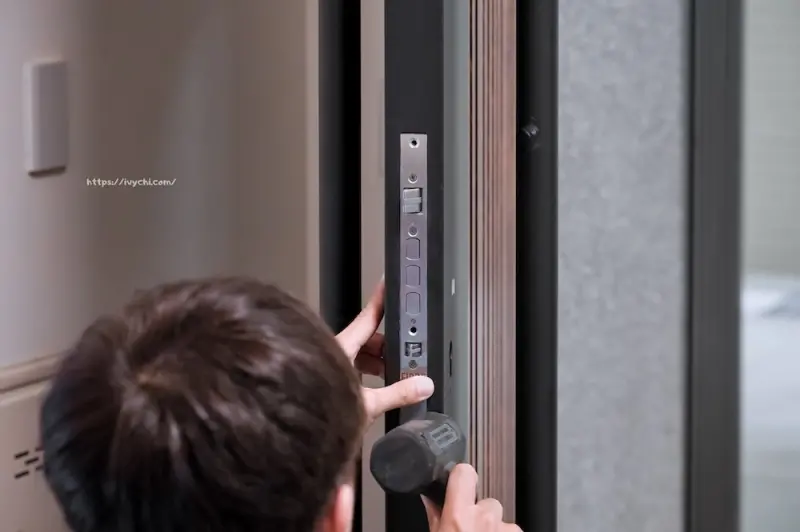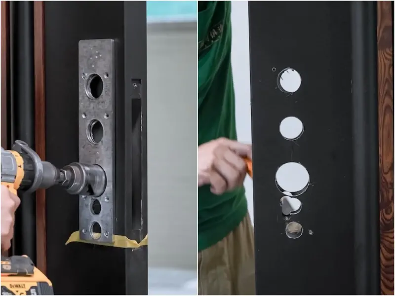安裝好門側的鐵件後,就會進行電子鎖的開孔,這地方絕對不能出錯,一旦圓孔位置跑掉就很麻煩,所以師傅會反覆確認多次才會進行,我都不知道門要被鑽成這樣XD