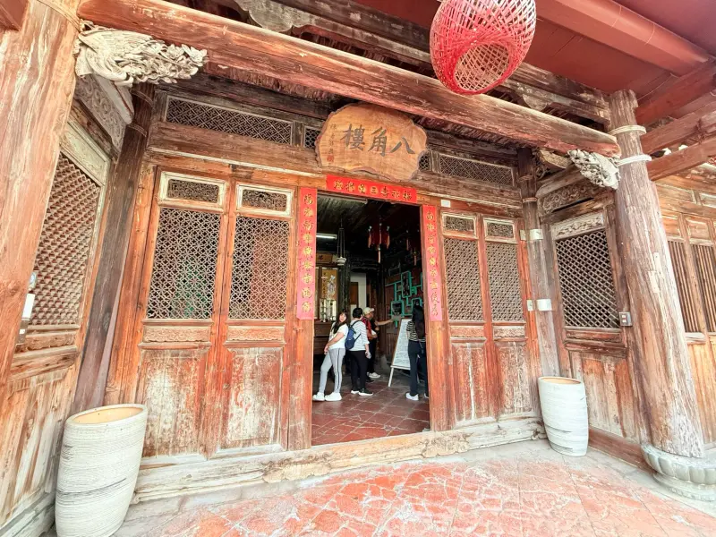 八角樓是鹽水的地標,位子就在月之美術館的斜對面,也是鹽水的葉家大宅,在日治時期已經以「史蹟名勝天然紀念物保存法」和「伏見宮貞愛親王御遺跡」立定爲歷史古蹟,也是臺南歷史建築十景和臺灣歷史建築百景的第7名。葉家大宅坐西朝東,有兩層樓高。一樓是祭祀祖先的大廳,由12支大福杉支撐的木造樑柱。非常的古色古香有歷史價值的一個值得前來參訪的古樓。