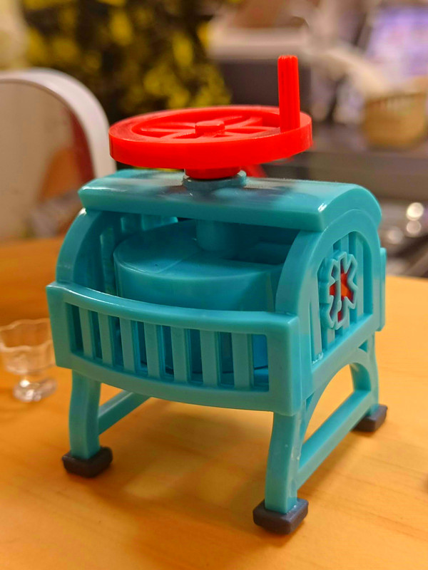 看得出來QQ田甜品工坊台中大義店開幕未久,門口開幕誌慶的花盆都還在呢。他們的店面是狹長的長方形空間,雖然不大,但佈置得溫馨而有巧思,幾張木質桌椅,搭配簡約的裝飾,營造出一個讓人放鬆的用餐環境,或許是因為新開幕就口碑爆棚,又或許是空間有限,店內座位不多,我們造訪時也幾乎是座無虛席,可見其受歡迎的程度,櫃檯上還擺了這個小小的刨冰機模型,綠色的機身搭配上方紅色的轉軸,充滿著古早味的情懷,這可是我們小時候最常見的刨冰機呢。