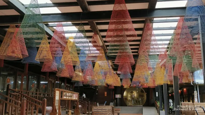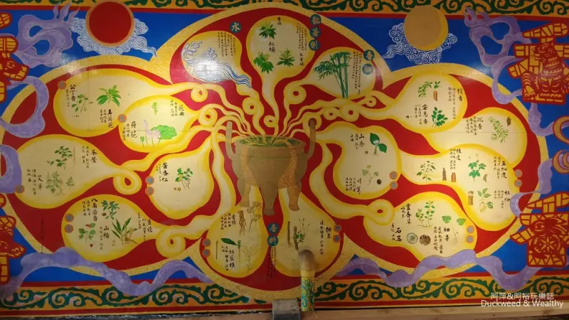 走進「新港香藝文化園區」的香藝文化館,馬上會聞到陣陣清新的香氣,真的很好聞。抬頭看看天花板,可以看到各種顏色的香環聚集在一起,畫面非常壯觀。館內還有好幾排用香做成的三牲,有雞、豬、魚,這些展示都讓大家覺得有趣又新鮮。整個長廊的牆壁上詳細介紹了香藝的歷史文化背景與各種用途,最特別的是,這裡還介紹到香原來也可以作為食用用途,這讓很多人都感到相當驚訝。