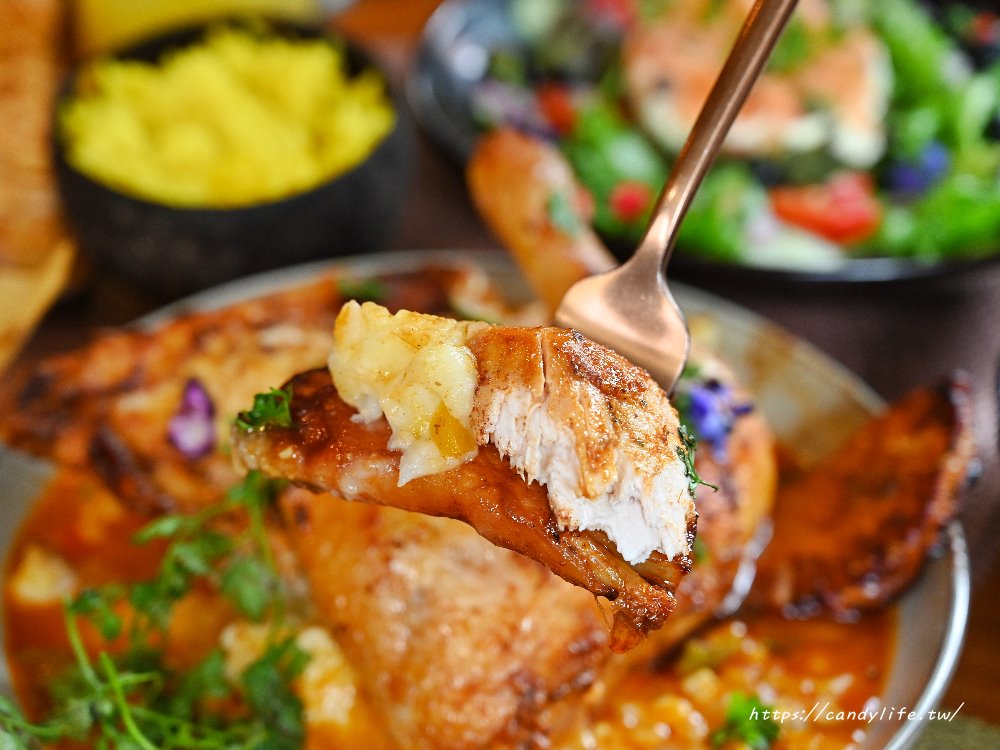 這道祕魯香料烤半雞是近期推出的新菜,曾經推出期間限定餐點而好評不斷,所以改為常態性餐點,採用台灣溫體雞,整隻秘料醃製的烤半雞,再將烤過的雞湯汁做出烤雞的醬汁,底下以馬鈴薯泥鋪底,搭配玉米及撒上肉桂粉炙燒過的新鮮鳳梨