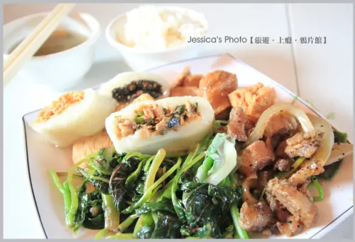 我們每個人都有一份紙盒便當,裡面用的都是在地食材,