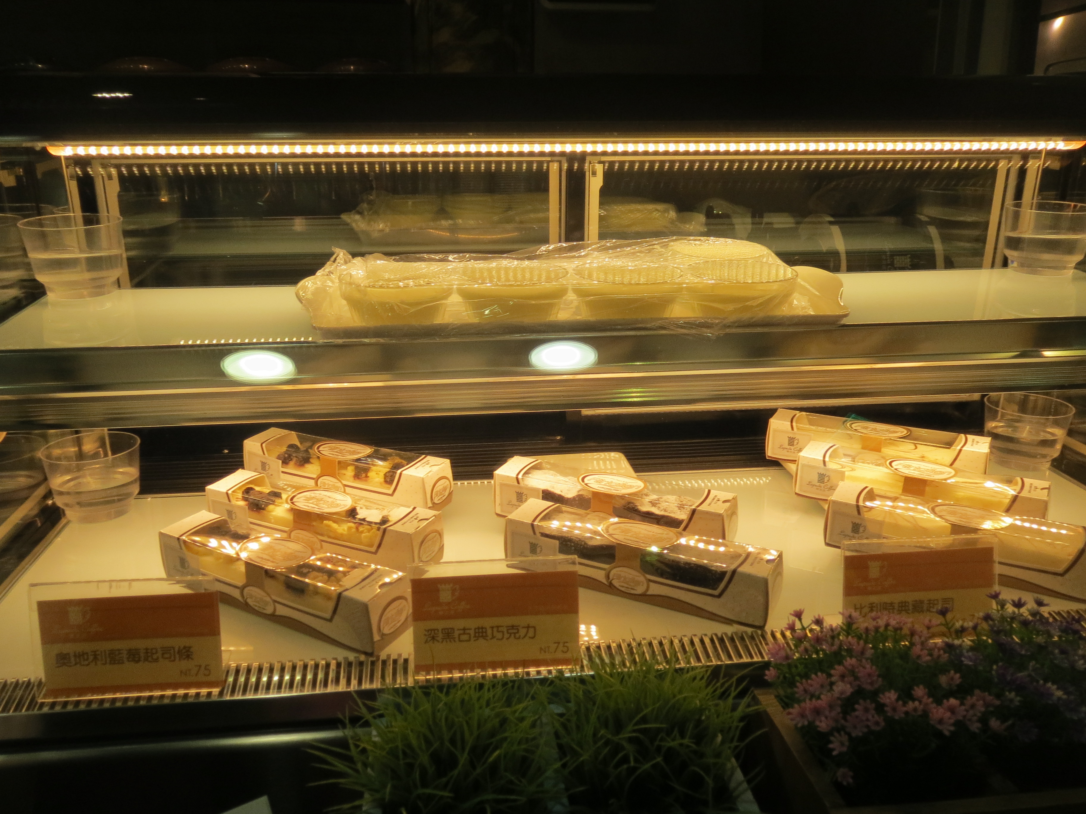 詢問過店員確認能夠使用優惠券之後,他們很熱心地推薦我點下午茶組合。這個組合有一杯飲料和一份蛋糕。蛋糕櫃裡的蛋糕都可以選;飲料的部分除了冰沙不能點之外,就沒有其他的限制了