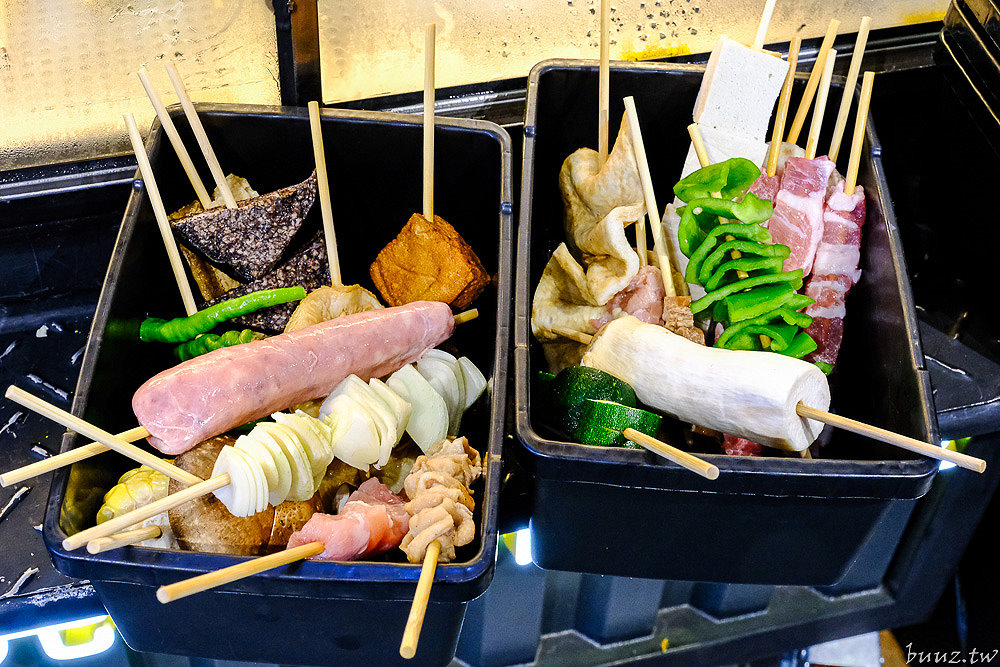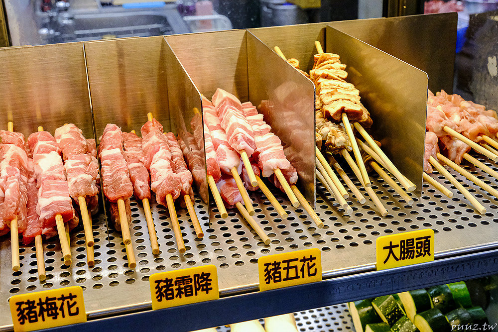 櫥窗內有陳列當天供應的各式串燒,舉凡常見的米血、豆包、甜不辣、貢丸這類燒烤必吃的食材,或是豬、牛、雞肉串等肉串,也有洋蔥、玉米、杏鮑菇等蔬菜可以肉菜均衡一下。