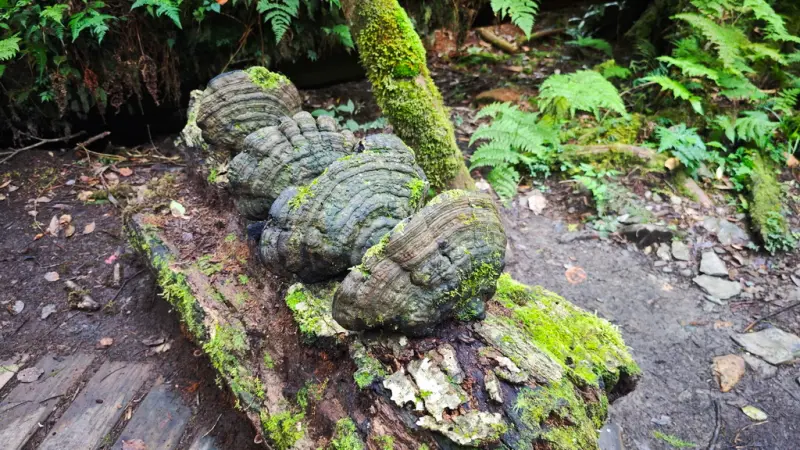 在覆滿青苔的倒木上,長著一排排宛如香菇的森林守護者。它們靜靜地待在樹幹上,就像宮崎駿動畫裡的精靈,守候著這片古老森林。若是你停下腳步仔細凝望,彷彿能聽見它們用微弱的聲音,向你訴說山林的祕密。