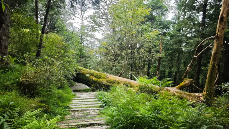 長線步道則適合體力較好的旅人,能一次看遍更多神木,沉浸在森林深處的氛圍裡。我這次選擇的是長線步道。一路上,空氣清新到讓人忍不住深呼吸,每一次吸入胸腔的芬多精都像是洗滌心靈的香氛。樹梢間偶爾有鳥鳴響起,陽光穿透霧氣打在苔蘚上,閃爍著翠綠光澤。每一步都像走進畫中,既壯麗又溫柔。