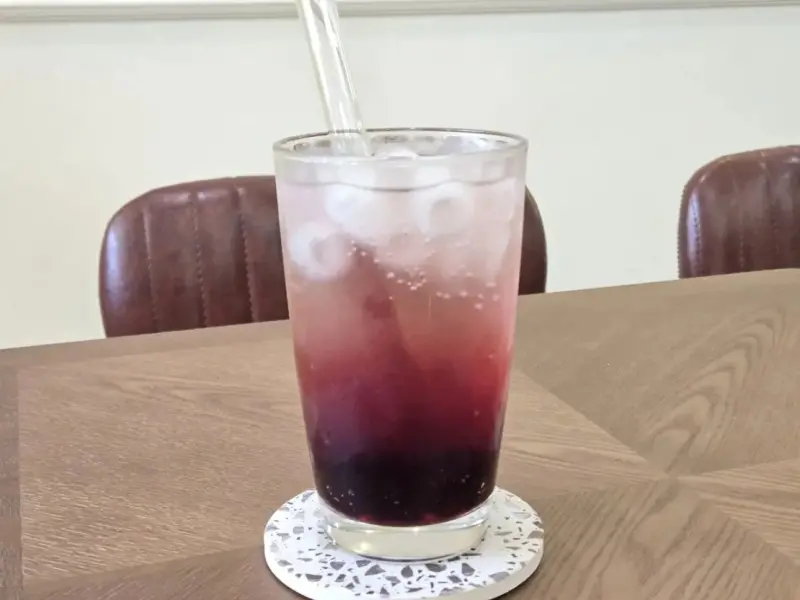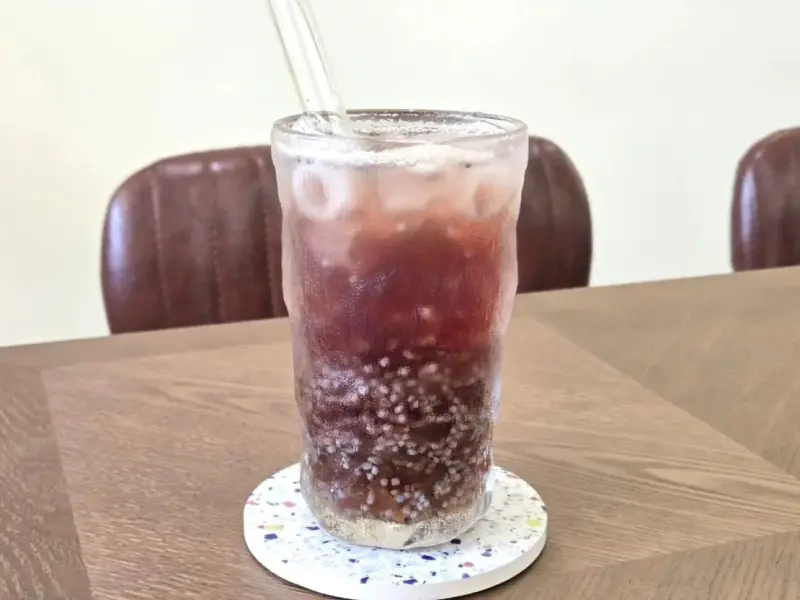 喝的部分我先選了葡萄氣泡飲,裡面加入原味寒天球,喝起來清爽又有口感。葡萄香氣自然不造作,搭配氣泡的刺激感,讓人一口接一口停不下來。寒天球比珍珠更清爽,整體非常適合炎熱的午後來一杯,搭配甜點剛剛好。這杯飲品也很適合安排在東海一日遊的行程中,作為中途的療癒補給。