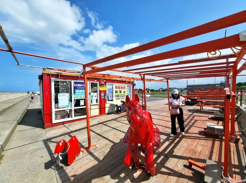我們的濟州島旅行在中午享用完道地的濟州黑毛豬風味餐後,從濟州市區一路往西前進。海的氣息逐漸濃烈,陽光也從都市的玻璃反射,轉換成海面跳耀的銀光,我們來到知名的梨湖港紅白馬燈塔。這兩座紅白馬燈塔是以濟州島特有的濟州小馬為藍本設計的,不僅造型生動可愛,還反映出當地的文化特色,是梨湖港最亮眼的地標。一下車,首先映入眼簾的是位於防波堤尾端比較遠的白馬燈塔,給人的第一印象就是怎麼那麼可愛。