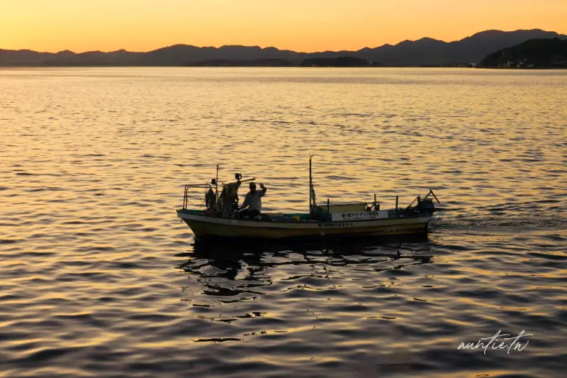 「嫁ヶ島夕日公園」是最多人等待夕陽的地方,湖邊有階梯可以坐著等待。這裡距離美術館只有一站而已,松江 Lake Line 循環巴士的紅色路線公車可以到達。嫁島也被稱為媳婦島,是宍道湖西邊的一個小島,上面還有一個小神社,在令和3年還登錄為文化紀念物。從「嫁ヶ島夕日公園」看到的落日西下,可以看到嫁島剪影與夕陽的結合,還有水鳥飛過,寧靜的湖面交織成絕美的景色。最後太陽會降到西邊的山頭,夕陽餘暉金光閃閃的也很美麗。看完夕陽後,就可以搭車回飯店,這次入住的是宍道湖旁的一畑飯店。